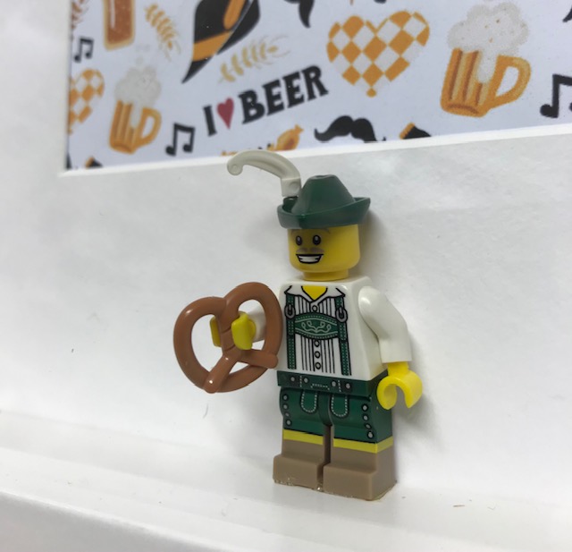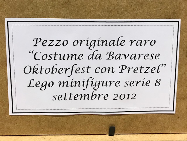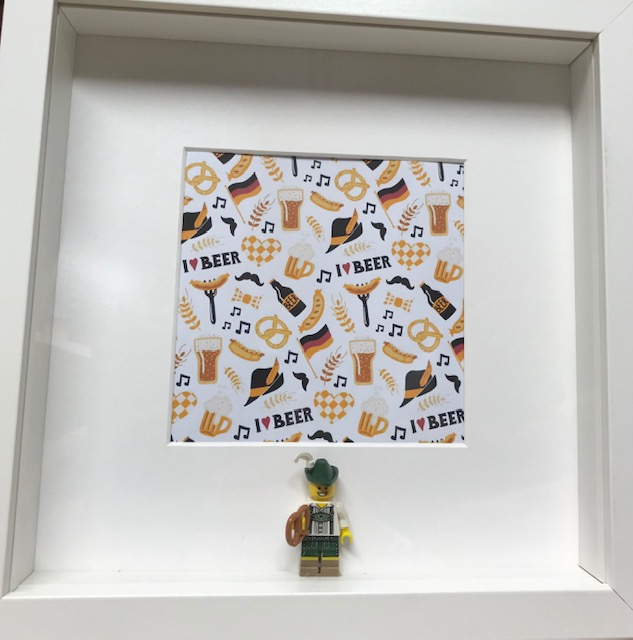 Cornice cm 25×25 con Minifigura Lego , costume da bavarese oktoberfest con pretzel, serie 8 – settembre 2012