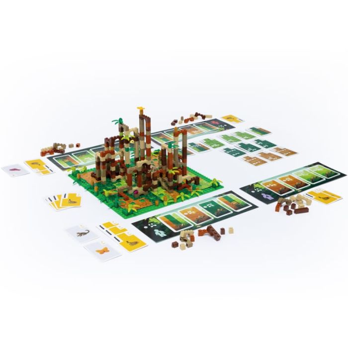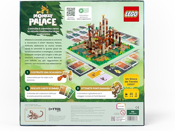 Gioco da tavolo a tema costruzione. I giocatori competono per costruire scalinate di mattoncini LEGO nel “palazzo della scimmia”, accumulando Punti Banana come vittoria.